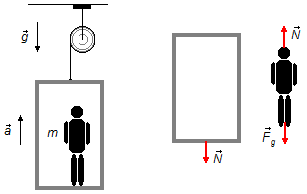 - \( \vec N \): kraft, mit der der Mann auf den Boden des Aufzugs wirkt.