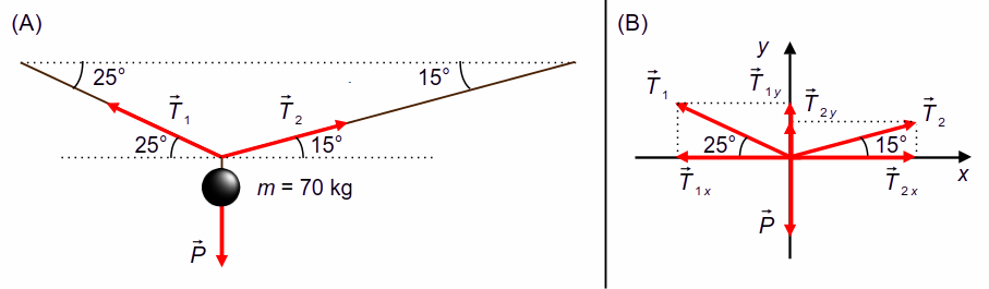 Desenhamos as forças em um sistema de eixos coordenados xy e decompomos as forças nessas direções (Figura 1-B). A força peso tem apenas a componente na direção y negativo. A força de tensão 1 possui uma componente na direção x positivo e uma componente na direção y negativo. A força tensão 2 possui uma componente na direção x positivo e uma componente na direção y positivo.