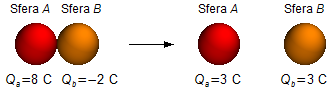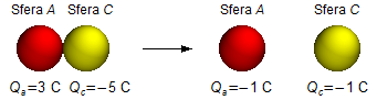 Mettendo le sfere A e C a contatto, la carica totale si distribuirà in modo uguale tra le due sfere, e la carica finale di ciascuna sarà la media delle cariche iniziali. In questo caso, la carica della sfera A è quella acquisita dopo il contatto con B ( \( Q_a=3\;\mathrm C \) )