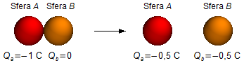 Mettendo nuovamente le sfere A e B a contatto, la carica totale si distribuirà in modo uguale tra le due sfere e la carica finale sarà la media delle rispettive cariche. Per la sfera A si considera il valore calcolato dopo il contatto con C ( \( Q_a=-1\;\mathrm C \) ) e per la sfera B si considera il valore dopo essere stata messa a terra ( \( Q_b=0 \) )