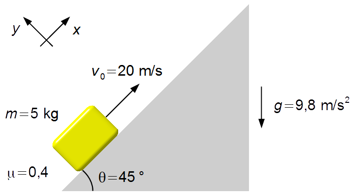 Un blocco, di massa 5 kg, è lanciato con velocità iniziale di 20 m/s in direzione ascendente su un piano