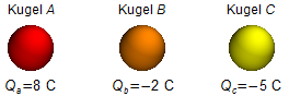 Eine elektrisch geladene Kugel A mit einer Anfangsladung von 8 Coulomb wird mit einer anderen Kugel B in Kontakt gebracht, die eine Ladung von −2 Coulomb besitzt. Nach dem Trennen wird Kugel B mit der Erde verbunden. Anschließend wird eine weitere Kugel C mit einer Anfangsladung von −5 Coulomb mit Kugel A in Kontakt gebracht und danach wieder getrennt. Schließlich wird Kugel A erneut mit Kugel B in Kontakt gebracht und wieder getrennt. Gesucht sind die Endladungen jeder Kugel. Es wird angenommen, dass die drei Kugeln gleich groß sind und aus dem gleichen Material bestehen.