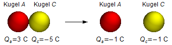 Wenn nun die Kugeln A und C in Kontakt gebracht werden, verteilt sich die Gesamtladung wiederum gleichmäßig auf beide Kugeln. Die Endladung jeder Kugel ist der Mittelwert der Ladungen vor dem Kontakt. Die Ladung von Kugel A ist dabei die zuvor nach dem Kontakt mit B erworbene Ladung ( \( Q_a=3\;\mathrm C \) )