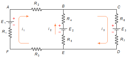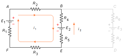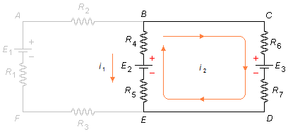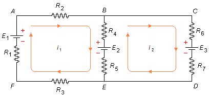 En primer lugar, a cada malla del circuito le asignamos, aleatoriamente, un sentido de corriente. En la malla ABEFA tenemos la corriente i1 en sentido horario y en la malla BCDEB tenemos la corriente i2 también en sentido horario (Figura 1)