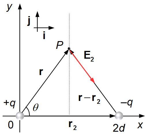 O vetor r−r2 vai da carga até o ponto P, e é dado por