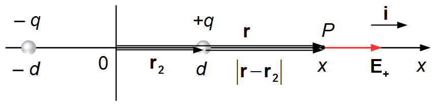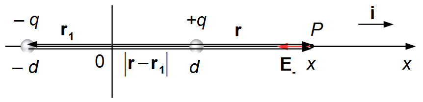 \mathbf{E}=\frac{q}{4\pi\epsilon_{0}}\left\{\frac{-1}{\left(x+d\right)^{2}}+\frac{1}{\left(x-d\right)^{2}}\right\}\;\mathbf{i}\\[5pt]