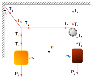 \frac{T_{3}\operatorname{sen}\theta}{T_{3}\cos \theta}=\frac{m_{2}g}{m_{1}g}\\[5pt]