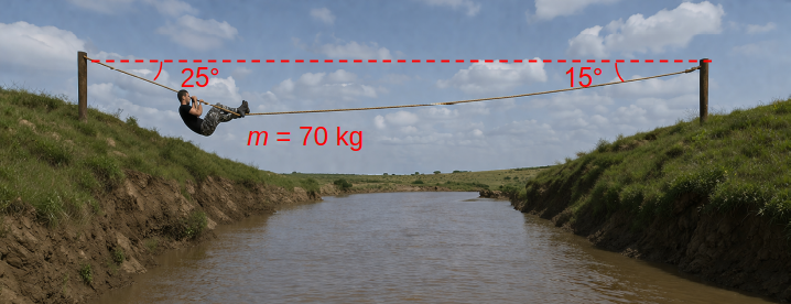 Un homme de masse égale à 70 kg traverse un pont de corde au-dessus d’une rivière, comme montré sur la figure.