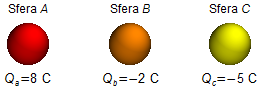 Una sfera A, inizialmente con una carica di 8 coulomb, viene messa a contatto con un'altra sfera B, con una carica di −2 coulomb. Dopo essere state separate, la sfera B è messa a terra. Successivamente, un'altra sfera C, con carica iniziale di −5 coulomb, viene messa a contatto con la sfera A e poi separata. La sfera A viene quindi nuovamente messa a contatto con la sfera B e successivamente separata. Si chiede di calcolare le cariche finali di ciascuna sfera. Si supponga che le tre sfere abbiano le stesse dimensioni e siano fatte dello stesso materiale.