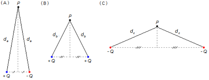 Determinare il potenziale elettrico nel punto P nei casi (A), (B) e (C) della figura sotto, con