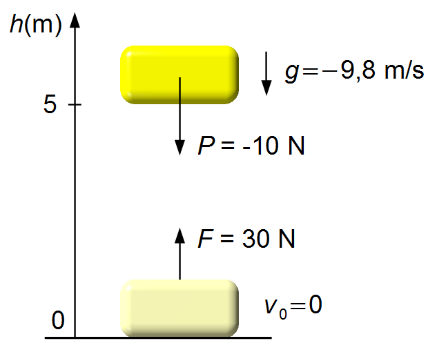 Un peso di 10 N viene sollevato, a partire dal riposo, da una forza di 30 N fino a un’altezza di 5 m. Determinare: